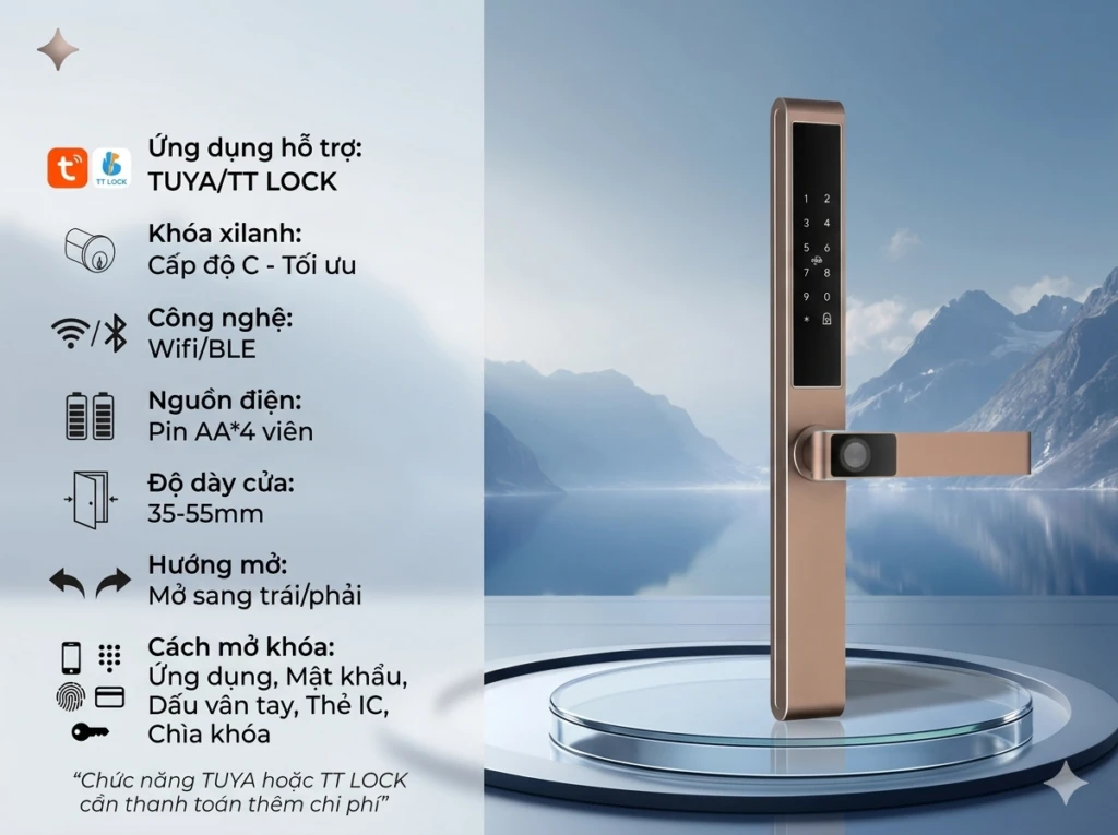 Với thiết kế hợp kim nhôm cao cấp, tích hợp công nghệ hiện đại như Wifi/BLE, hỗ trợ ứng dụng TUYA và TT LOCK, sản phẩm mang đến trải nghiệm sử dụng tối ưu cho mọi gia đình.